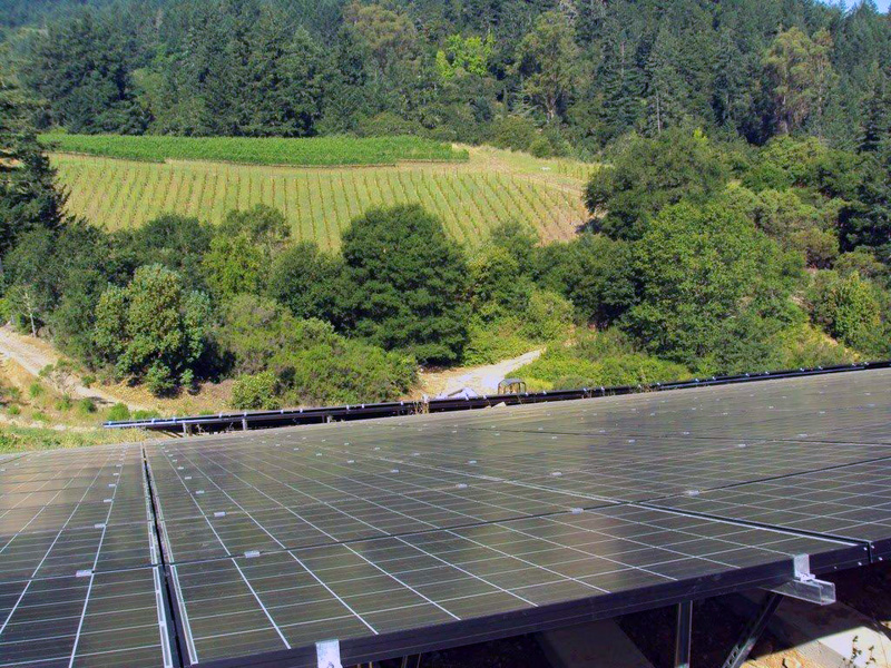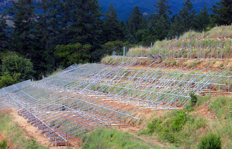 As with all wineries, available land is at a premium. So when we had to pick a suitable location for their PV installation, we were presented with the challenge of installing a 346.4Kw DC ground mount system on a 25 degree slope almost 1500 linear feet away from the main electrical service. We also needed to engineer an upgrade to the existing main electrical service panel and combine multiple meters on the property to optimize the electrical system design and maximize their savings.