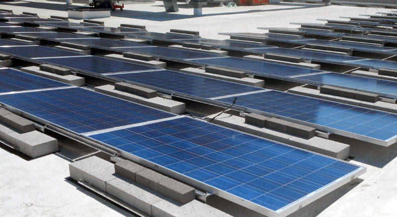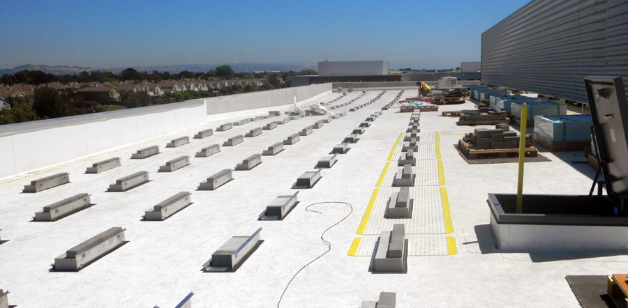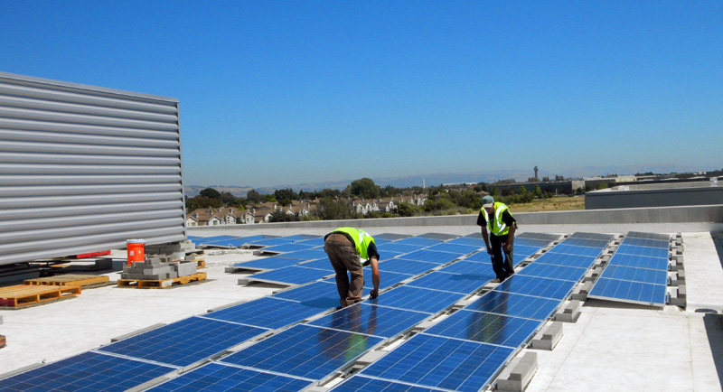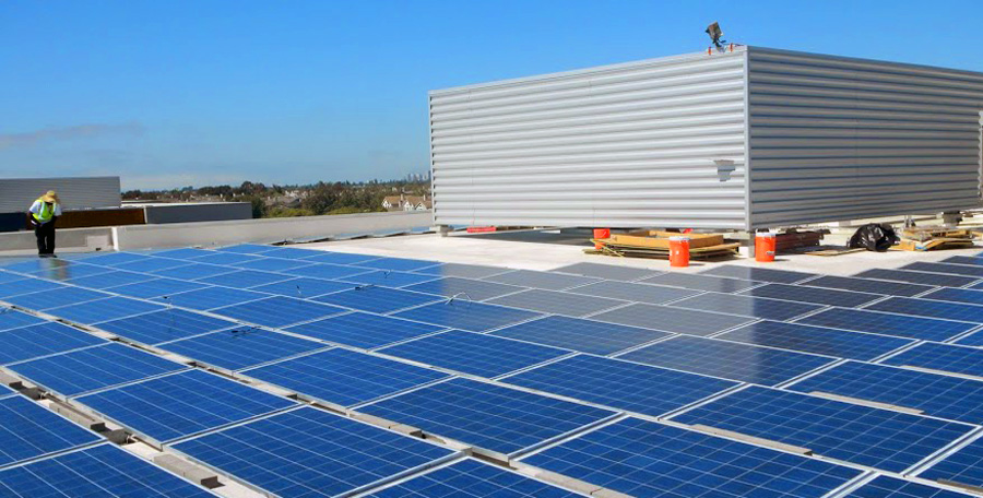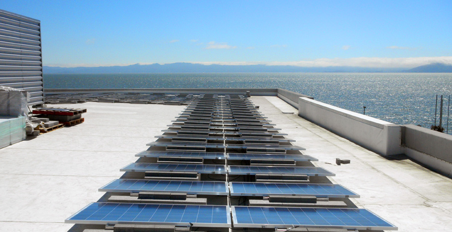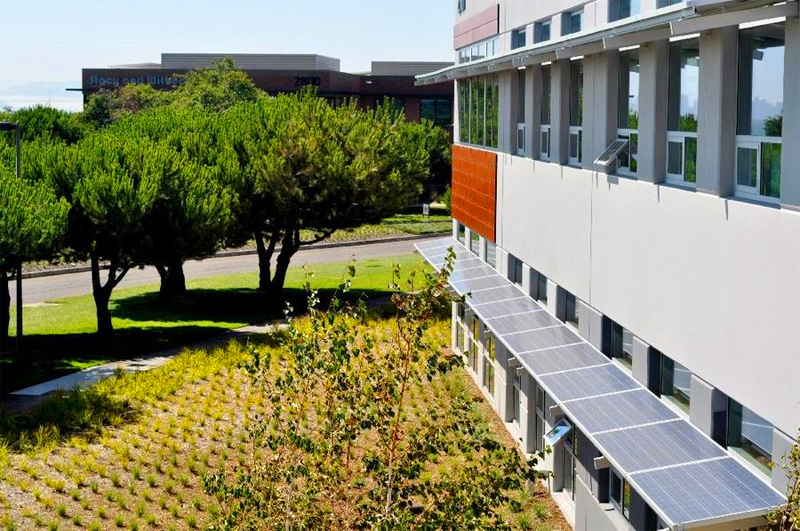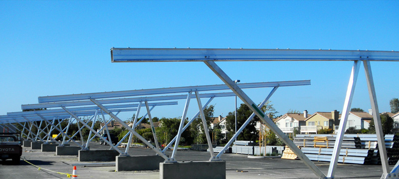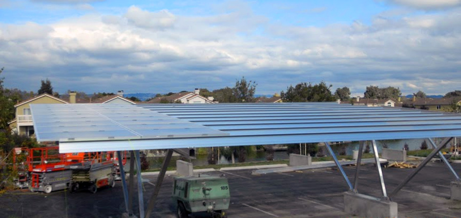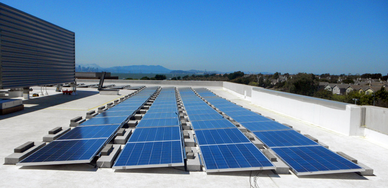This was a newly constructed campus in Alameda consisting of four separate buildings. Their requirements were for non-disruptive construction for four roof mounted systems and the installation of twelve carports in the employee parking areas. The total system size was 853.6kW DC.